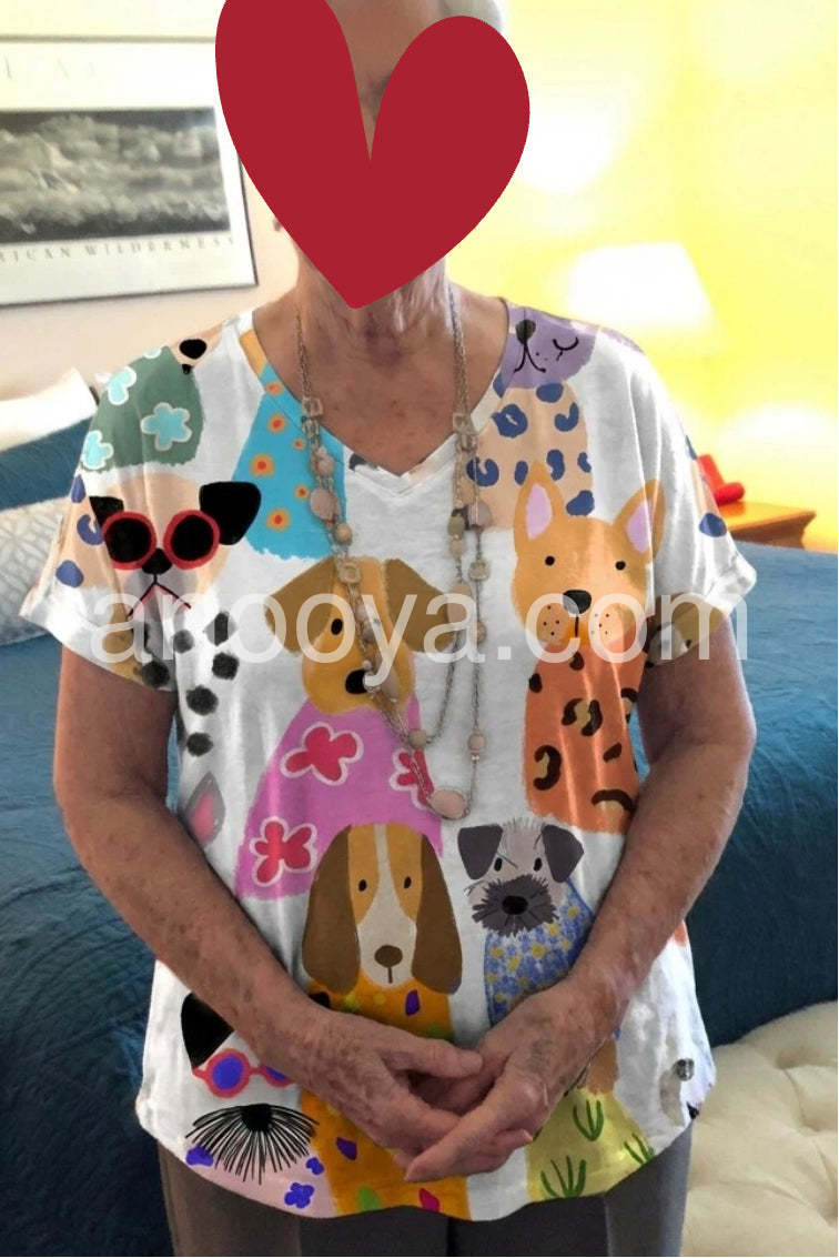 Brighten your day with this Whimsical Dog Print Short Sleeve Top, a cheerful and eye-catching piece that turns heads with its playful, hand-drawn style canine illustrations. Featuring an adorable array of cartoon dogs in vibrant outfits—complete with sunglasses, floral dresses, and bold patterns—this top brings a joyful, artistic flair to any outfit. Crafted from lightweight, breathable fabric—likely cotton or linen blend—it’s perfect for warm weather and casual wear. The relaxed fit, short sleeves, and soft V-neckline offer ultimate comfort and effortless style, making it ideal for beach days, brunches, or weekend outings. Whether you're a dog lover or simply adore fun fashion, this top is a must-have statement piece that blends humor, creativity, and charm. Pair it with white jeans, denim shorts, or flowy pants for a look that's both flirty and full of personality. Inspired by the whimsical spirit of brands like Lulus, this top celebrates individuality and lighthearted fashion—perfect for those who love to express their fun side with every step.