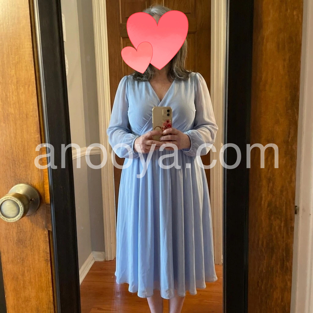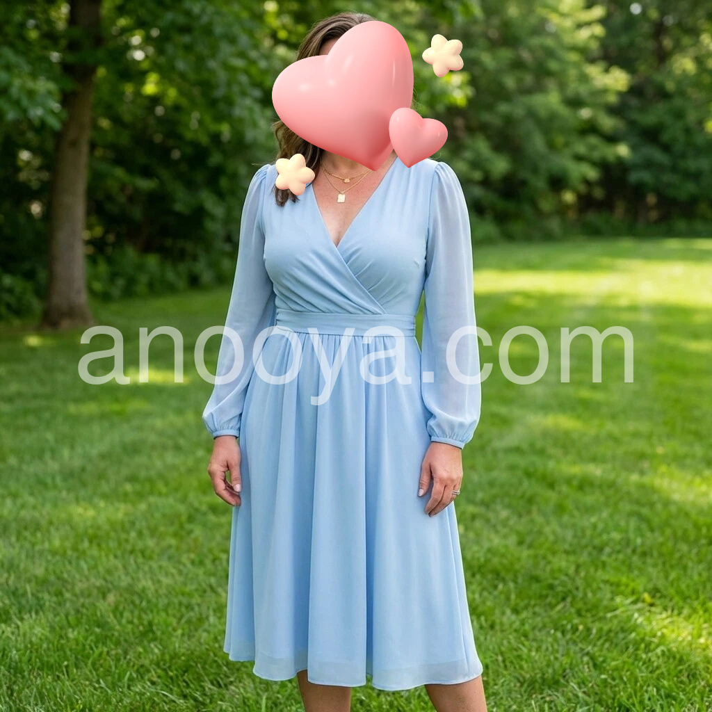 This dress is absolutely beautiful! The light blue color is so pretty and it looks very flattering. I love the V-neck and the long sleeves with a gentle puff—everything feels balanced and elegant. The fabric looks soft and breathable, and the skirt has a nice flow that doesn’t cling. It’s perfect for outdoor days and looks exactly like the photos. Highly recommend!