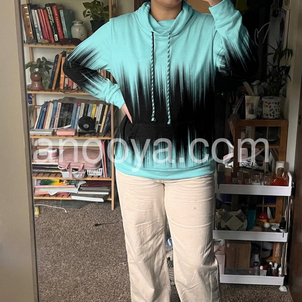 This ombre hoodie is a total game-changer for my casual wardrobe! The mint-to-black gradient is so eye-catching and unique, never seen anything quite like it. The soft, lightweight fleece feels amazing against my skin, and the cowl neck with drawstrings is perfect for snuggling up on cool days. It’s super comfy, fits true to size, and the bold print instantly elevates a simple jeans-and-tee look. I’ve gotten so many compliments whenever I wear it out!