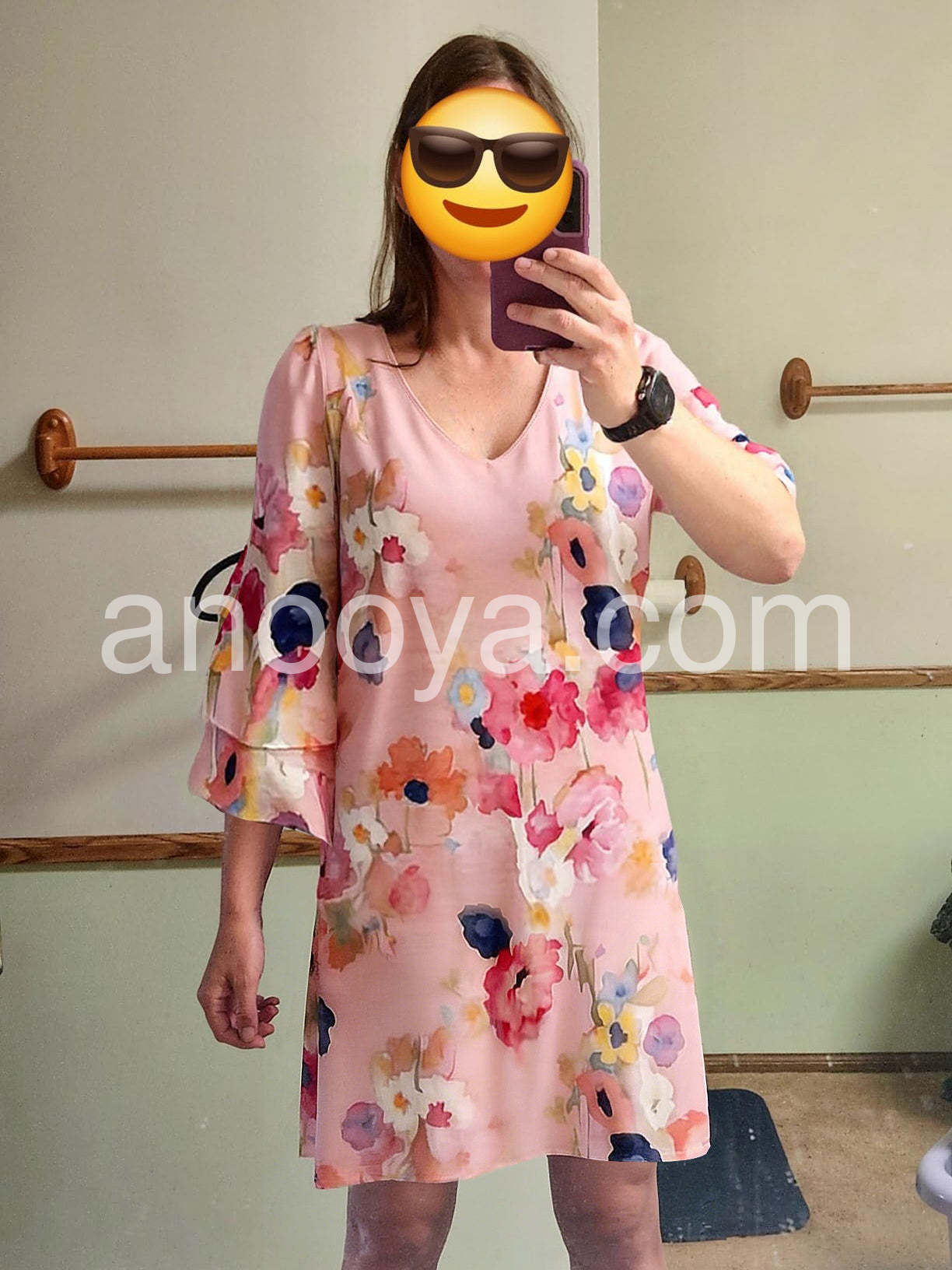 Embrace soft romance and effortless style in this Pink Watercolor Floral 3/4 Sleeve Mini Dress , a dreamy mini dress that captures the beauty of blooming spring. Crafted from lightweight, flowing fabric—likely chiffon or rayon blend—this dress features a delicate watercolor-inspired floral print in vibrant shades of pink, coral, navy, yellow, and white, creating a painterly effect across the soft blush base. The flattering V-neckline adds a touch of elegance, while the short ruffle sleeves bring playful volume and feminine charm. A relaxed, A-line silhouette ensures comfort and ease, making it perfect for casual days, brunches, or warm-weather outings. Paired here with layered bracelets and a pearl necklace, it exudes boho-chic appeal. Ideal for beach trips, garden parties, or weekend strolls, this dress brings a sense of lightness, joy, and timeless femininity to your wardrobe. Let this floral mini dress turn every moment into a gentle celebration of color and style.
