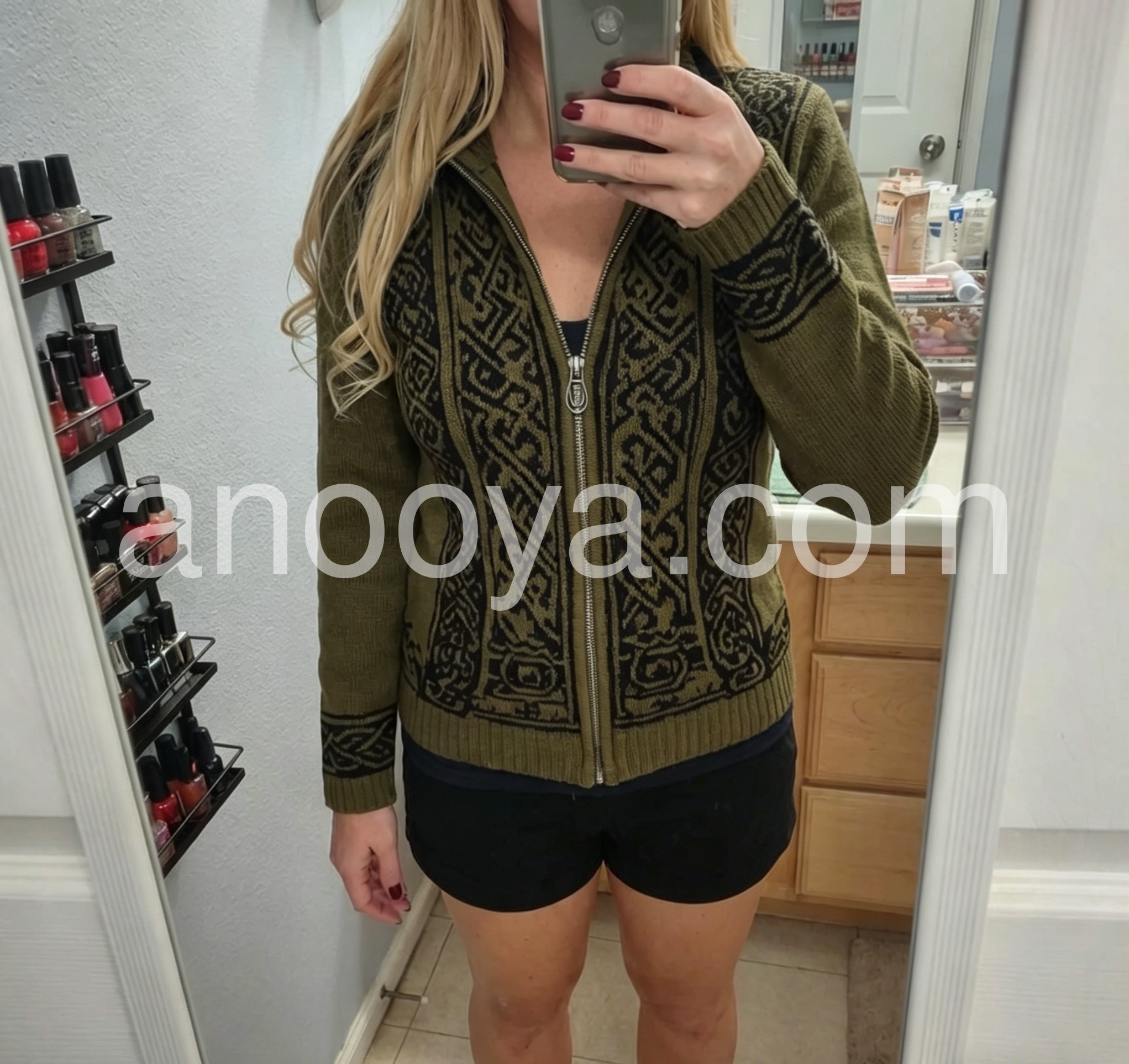 This olive green Celtic-pattern zip-up cardigan is such a standout piece! The thick, cozy knit is warm enough for crisp fall days, and the intricate black tribal-inspired pattern gives it such a cool, edgy vibe. The full-zip front makes it easy to layer, and the ribbed cuffs and hem keep the fit snug. I love pairing it with jeans and boots for a boho-rock look, and it gets compliments every time I wear it. The fabric is soft, durable, and holds its shape perfectly after washes.