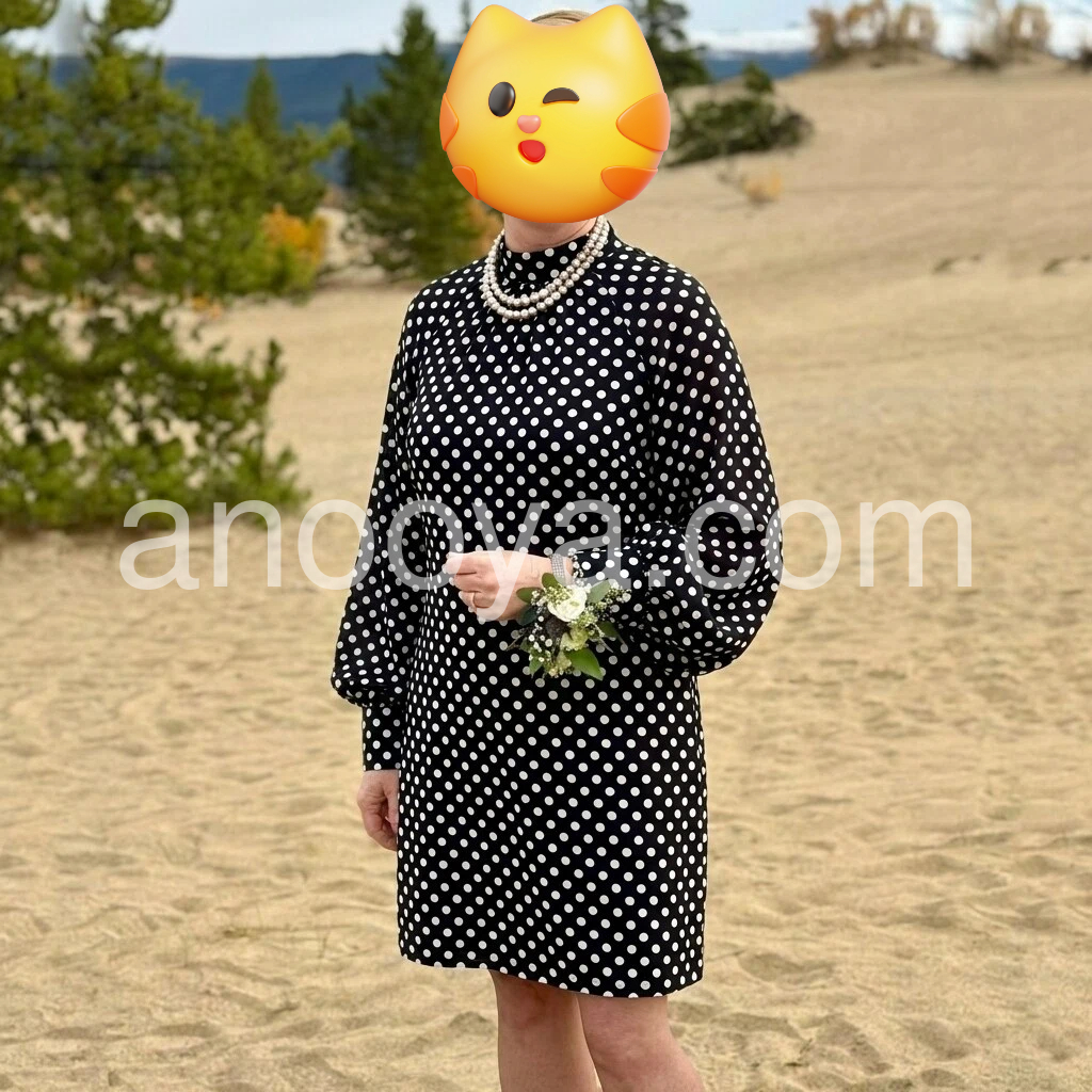 I’m really impressed by how elegant this dress looks on! The polka-dot pattern pops in the best way—playful but still chic—so it photographs beautifully too. The fit is flattering without restricting my movement, and the fabric feels soft against my skin. I wore it out with sneakers and it looked perfect for a casual outing, but it would also work great for a more dressed-up moment.