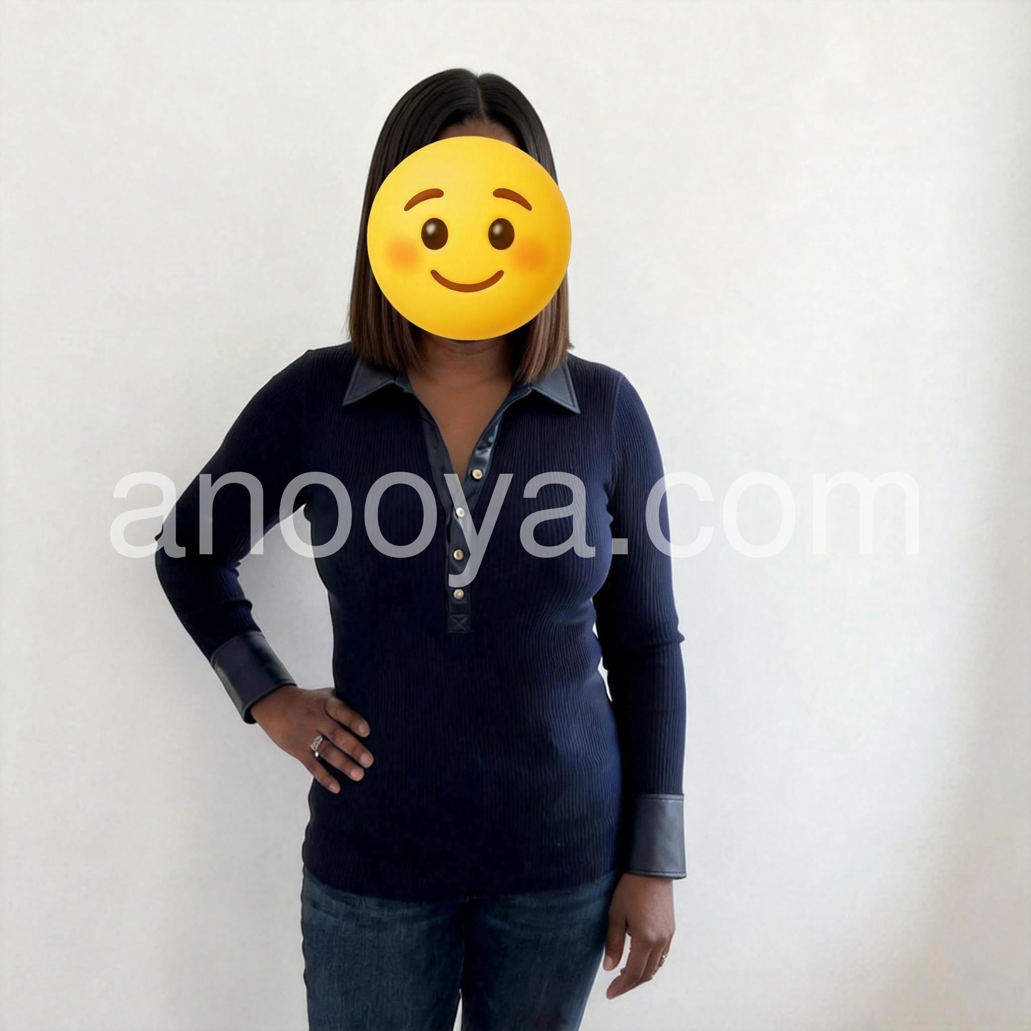 This navy ribbed top with the contrast trim is stunning--the gold buttons add just the right touch of sophistication, and the curved fit is incredibly flattering. Paired perfectly with distressed jeans for a chic, casual vibe.