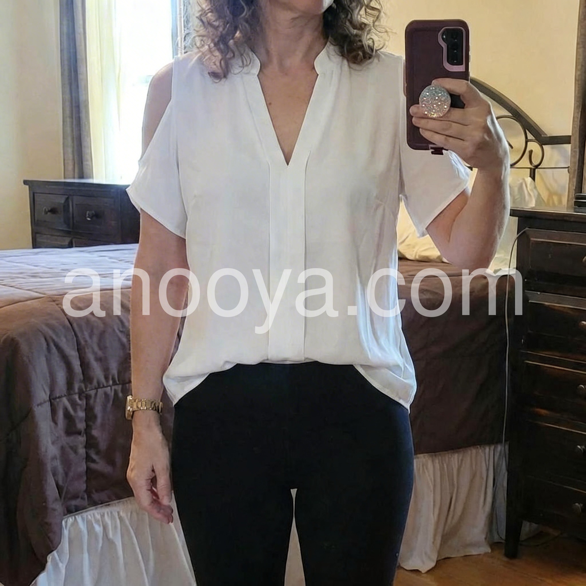 This shirt really flatters my figure. I love loose-fitting shirts, and even though the fabric is a bit thin, it has a great texture. Plus, it always makes me feel like it’s hiding my flaws—really.