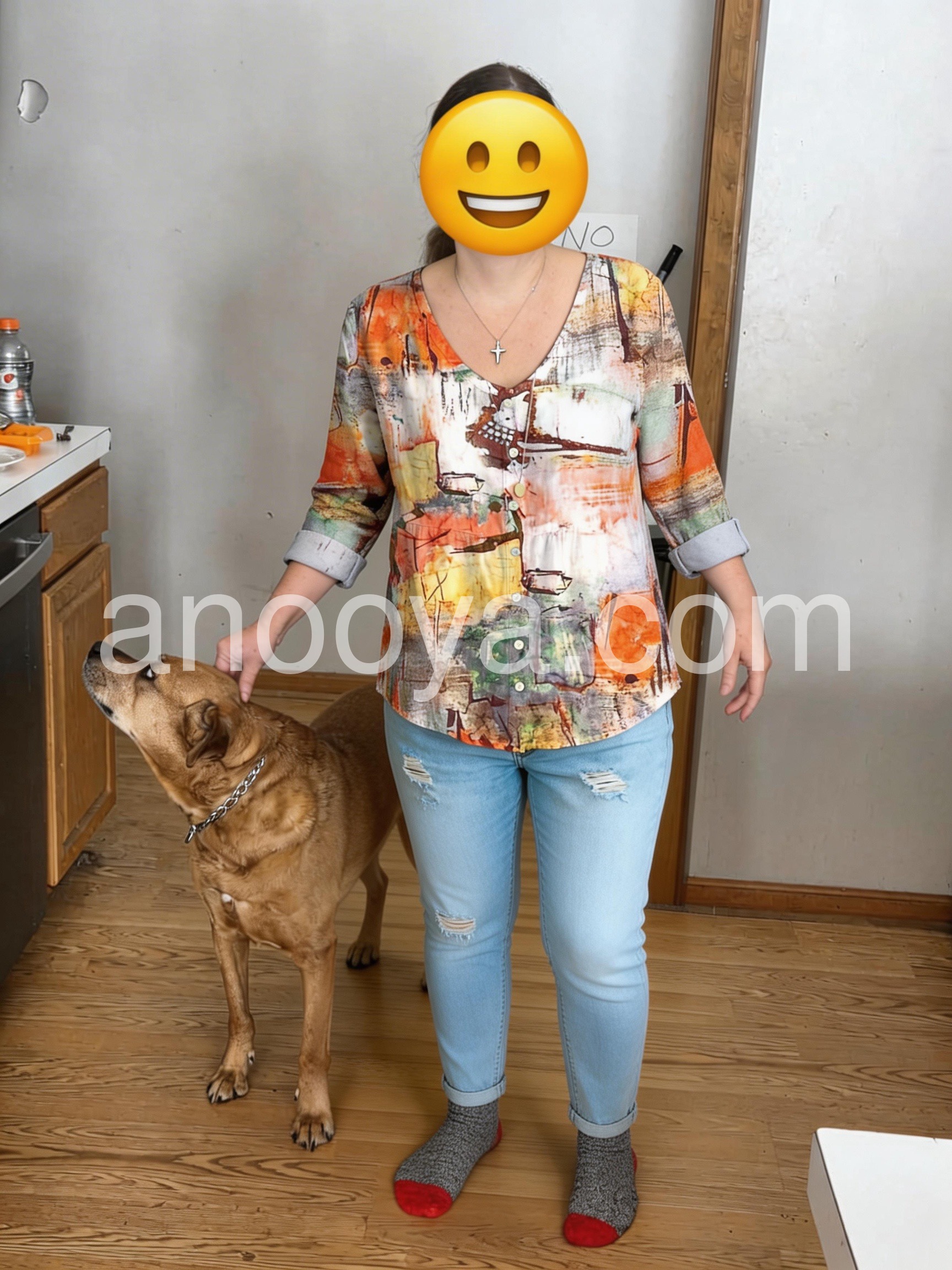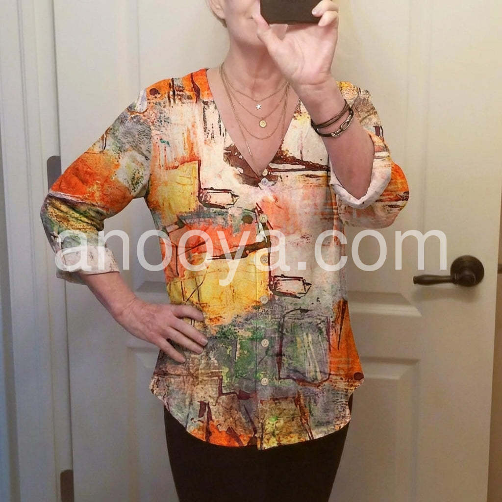 am obsessed with this watercolor print blouse! The blend of warm oranges, soft yellows, and subtle greens creates a stunning, artistic look that stands out without being overwhelming. The V-neck design is incredibly flattering. The fabric is lightweight, breathable, and has a lovely drape—no stiffness at all! It pairs seamlessly with jeans for a casual day out or dress pants for the office. The fit is true to size, and the small button detail adds a charming touch. I’ve already gotten multiple compliments and will definitely be buying more colors!