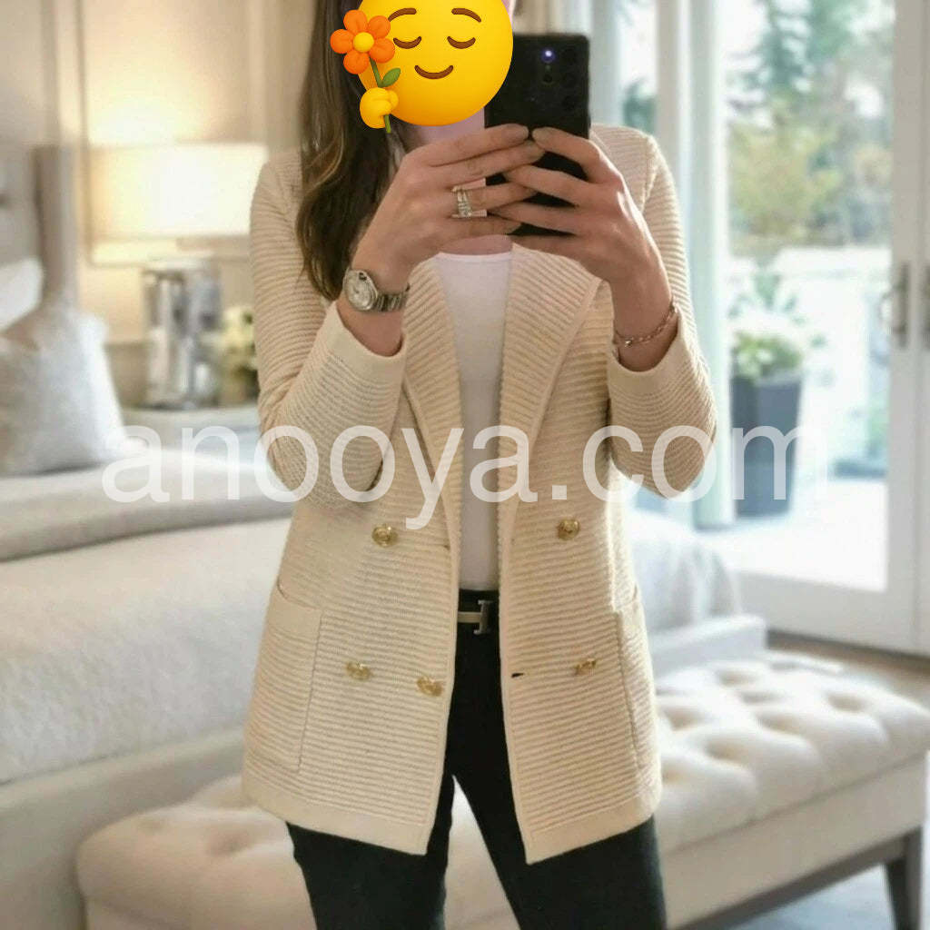 The ribbed texture is gorgeous and makes it look much more expensive than it is. The gold buttons add such a classy touch. Fit is true to size and very flattering.